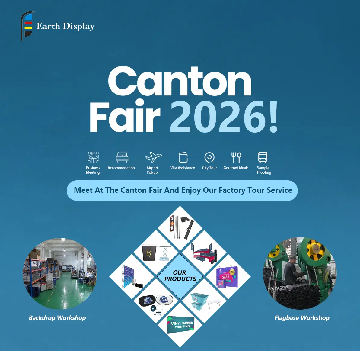 معرض كانتون 2026 على الأبواب، ونحن في Earth Display نأمل حقًا أن نراكم هناك. نحن نصنع أعلامًا من الريش، وخلفيات منبثقة، وقواعد أعلام، ولافتات فينيل مخصصة - أي شيء للمعارض والإعلانات - منذ أكثر من عشر سنوات حتى الآن. هذه المرة، بدلاً من مجرد التحدث عبر الإنترنت، نريد أن نظهر لك ما نقوم به وجهاً لوجه.